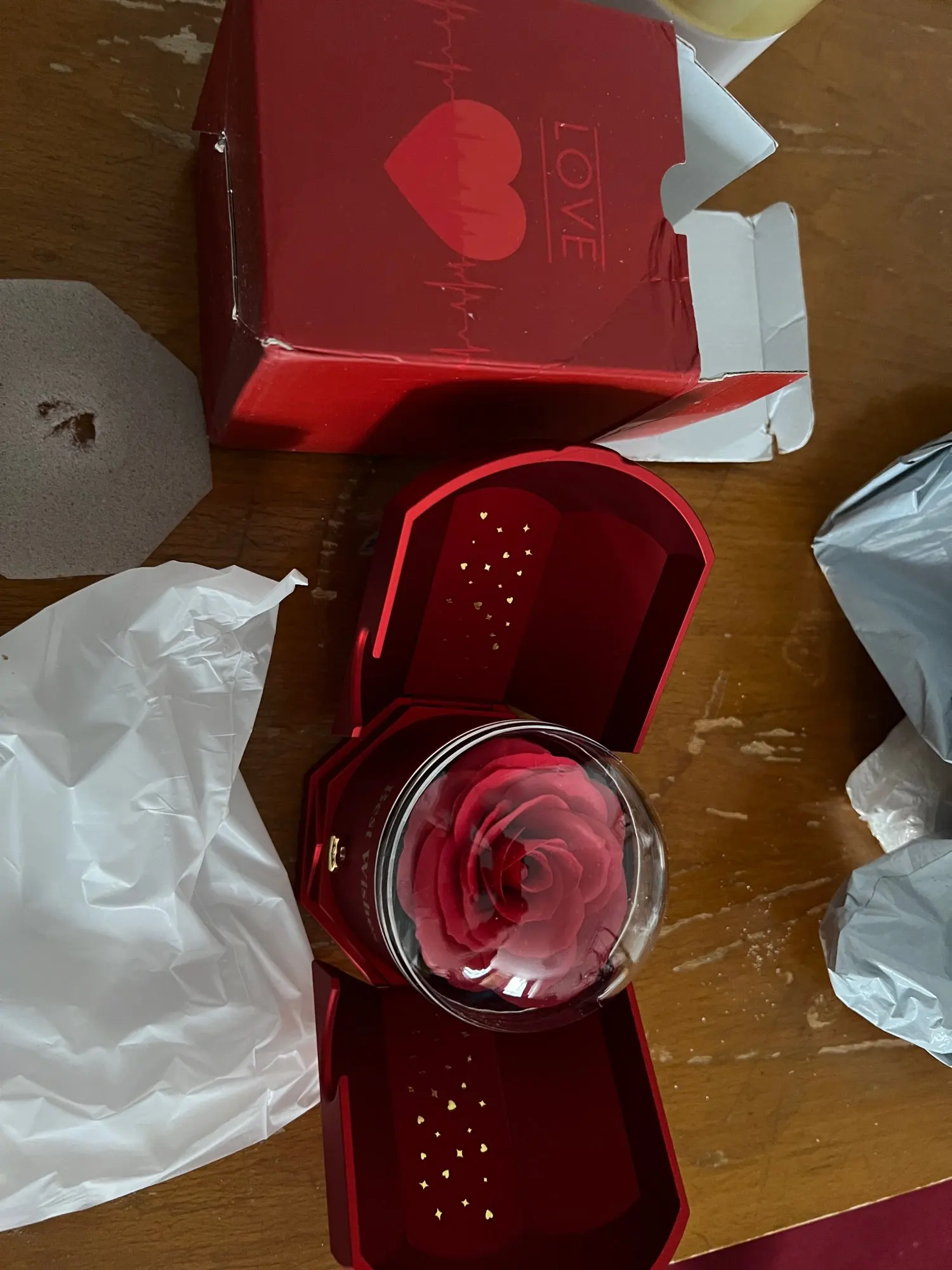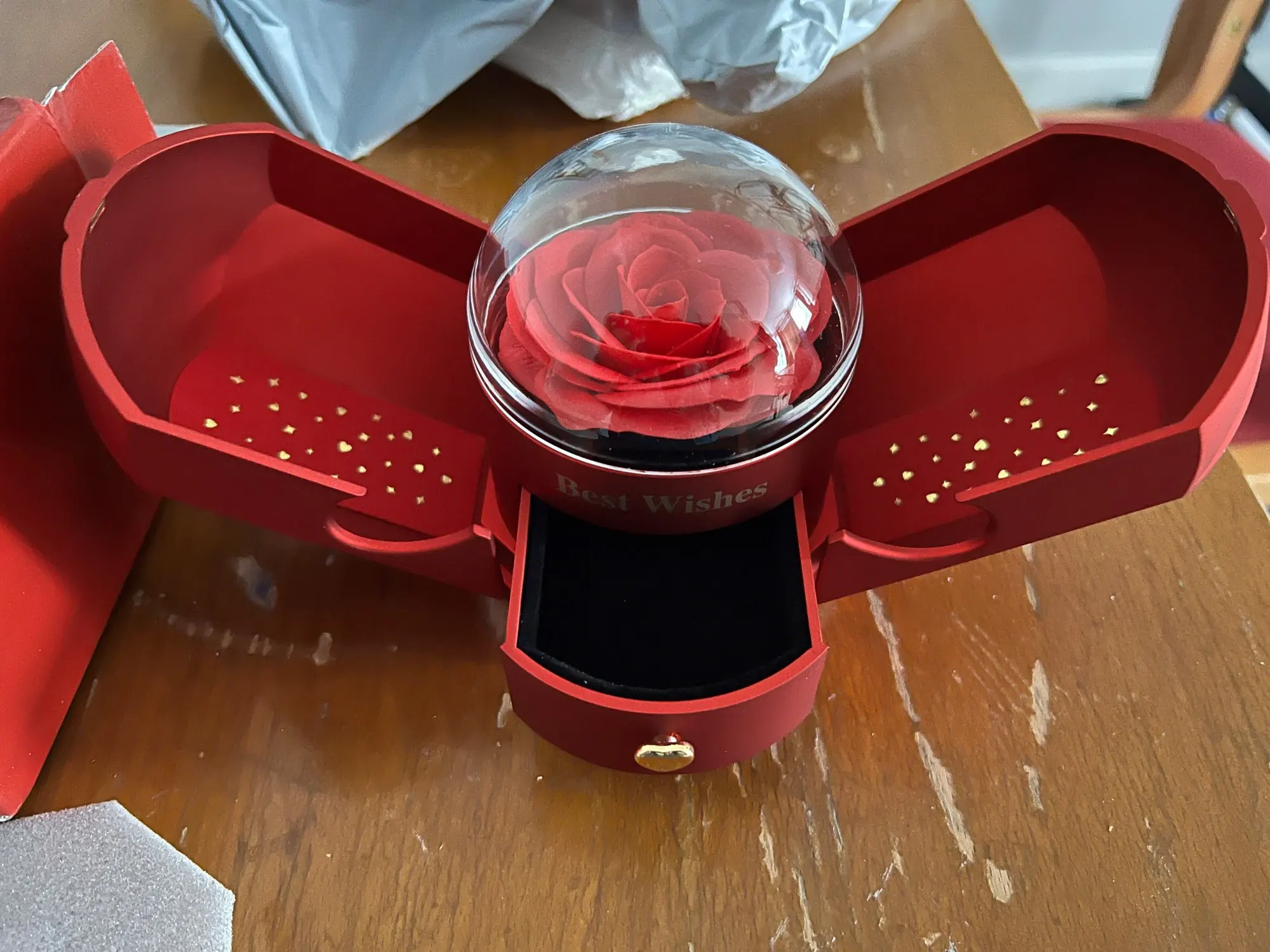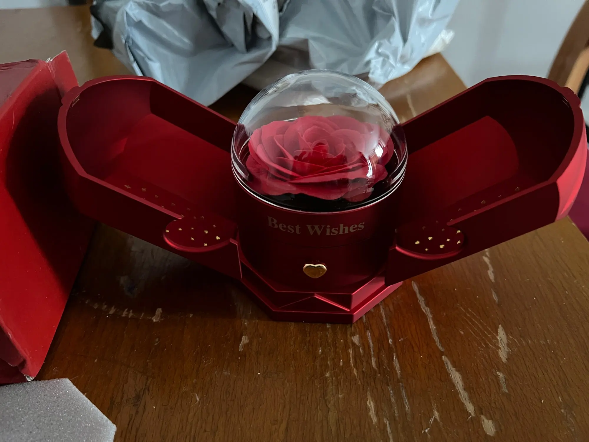 A simple vista, se presenta como una elegante caja decorativa, pero al abrirla revela una delicada rosa decorativa y un compartimento oculto perfecto para guardar una joya especial. Un regalo pensado para crear un momento inolvidable y lleno de significado.